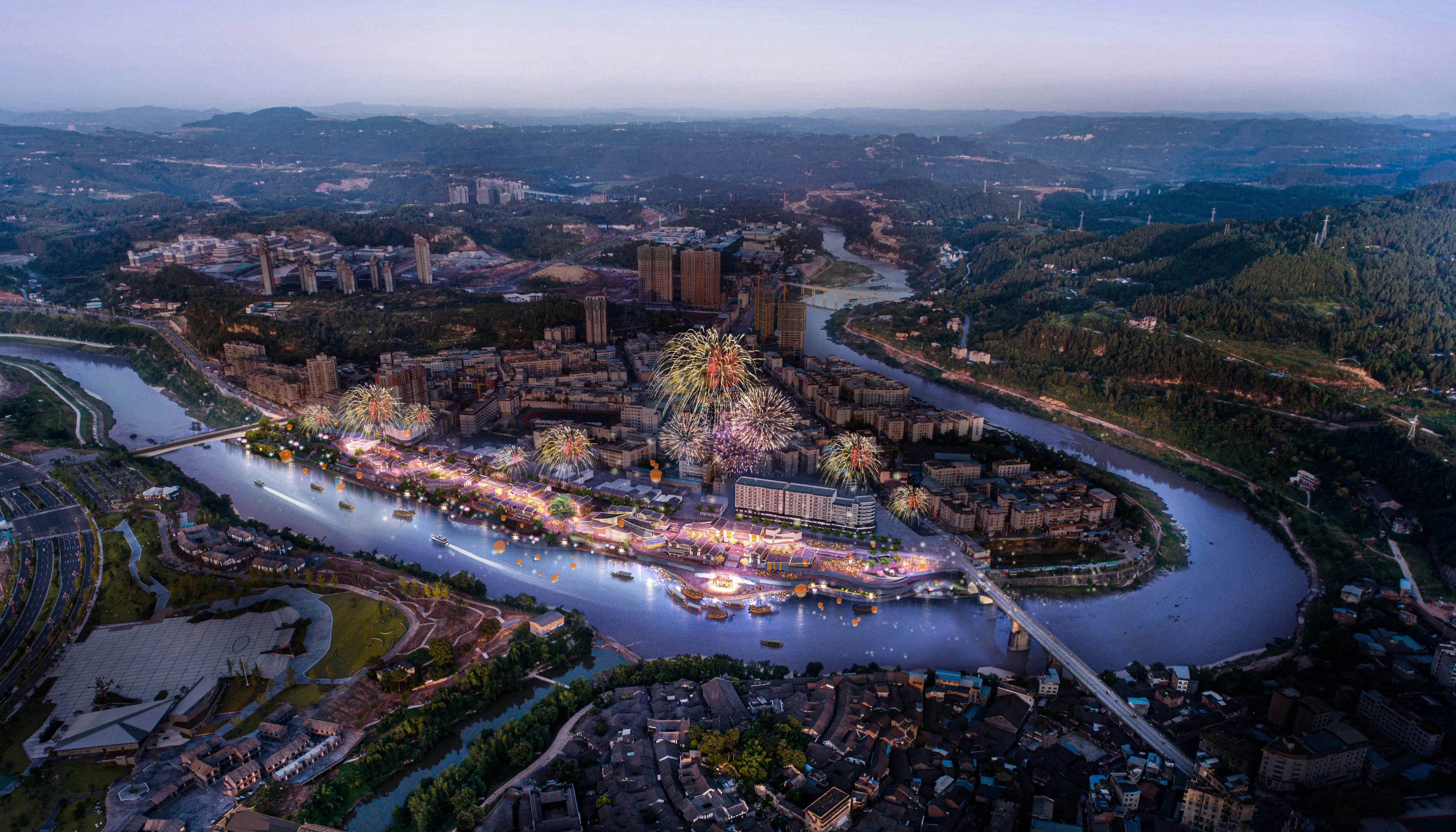 其中,無人機表演作為開街重點活動,在夜幕降臨時,1500架無人機編隊騰空而起,在仿古建筑群和恩陽河畔上空變換隊形,形成不同的特定圖案,將開街氛圍推向高潮,呈現(xiàn)出一場“人在畫中游、畫在景中走”的交互沉浸式場景。