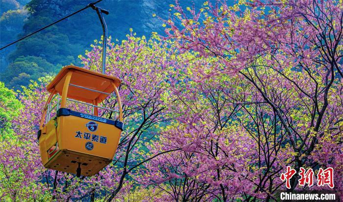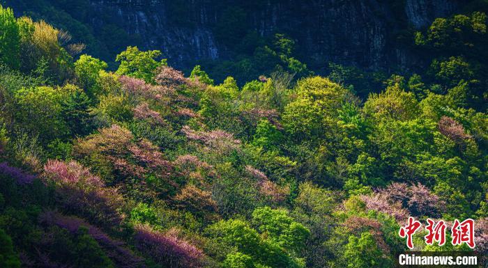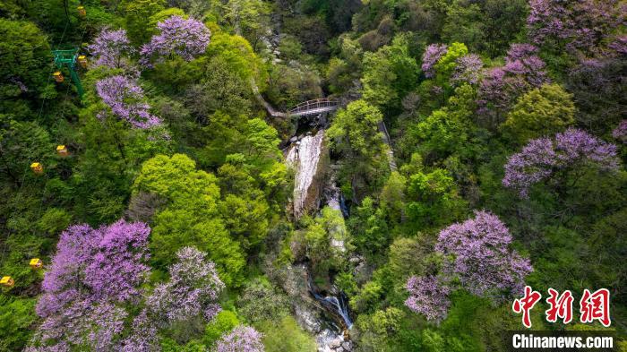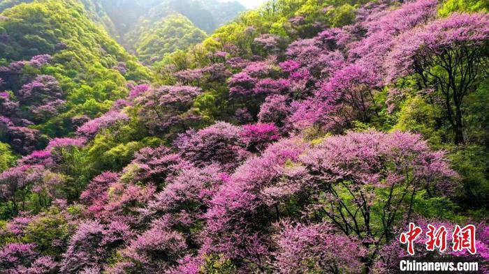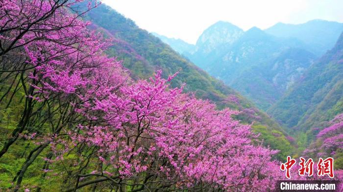 4月11日,漫山紫荊花與秦嶺交相輝映。太平國(guó)家森林公園供圖