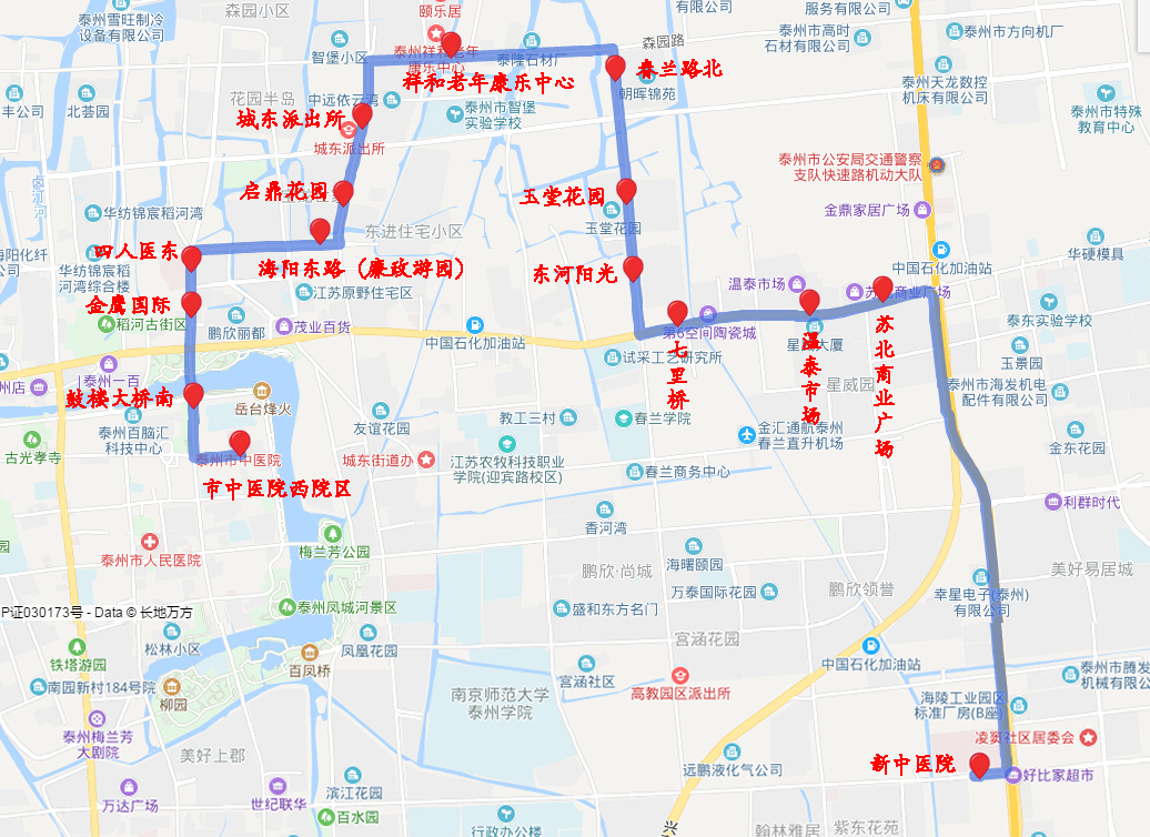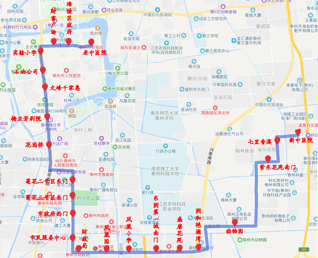 泰州市中醫(yī)院邑廟街院區(qū)-海陵區(qū)政府-財(cái)富廣場(chǎng)-實(shí)驗(yàn)小學(xué)-石油公司-文峰千家惠-梅蘭芳劇院-花園橋-蓮花二號(hào)區(qū)東門-蓮花三號(hào)區(qū)東門-市政府西門-市民服務(wù)中心-財(cái)政局-鳳凰園-鳳凰小學(xué)-東潤(rùn)第一城南門-盛唐花苑-潤(rùn)和艷瀾灣-動(dòng)物園-紫東花苑南門-七里香溪-泰州市中醫(yī)院濟(jì)川路院區(qū)