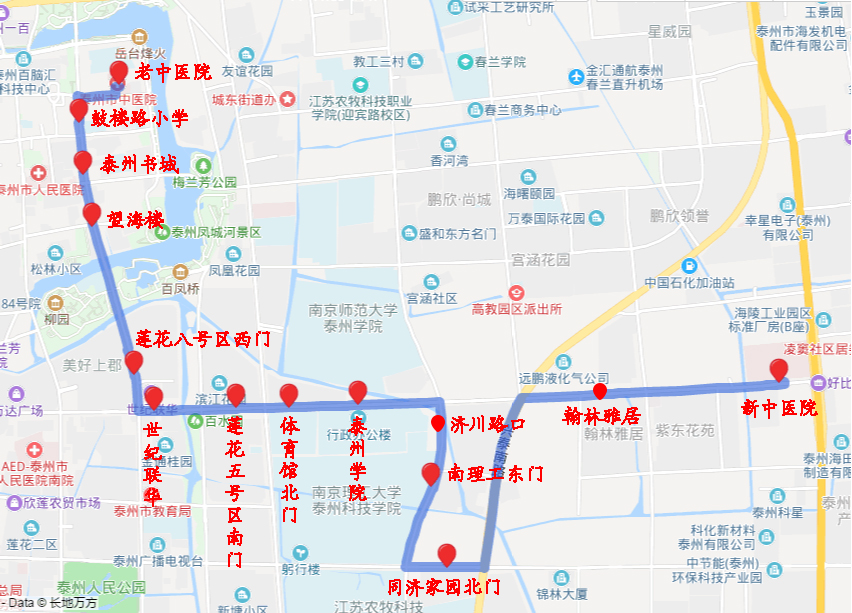 泰州市中醫(yī)院邑廟街院區(qū)-鼓樓路小學(xué)-泰州書城-望海樓-蓮花八號(hào)區(qū)西門-世紀(jì)聯(lián)華-蓮花五號(hào)區(qū)南門-體育館北門-泰州學(xué)院-濟(jì)川路口-南理工東門-同濟(jì)家園北門-翰林雅居-泰州市中醫(yī)院濟(jì)川路院區(qū)