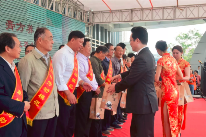 王華為勞模代表頒發(fā)膏方優(yōu)惠券并贈送我院特制養(yǎng)生袋泡茶飲