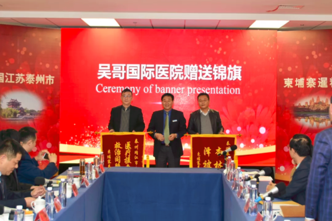 吳哥國(guó)際醫(yī)院院長(zhǎng)孫英杰向泰州市外事辦、市衛(wèi)健委、市僑聯(lián)代表及提供援柬醫(yī)療幫助的醫(yī)院贈(zèng)送錦旗