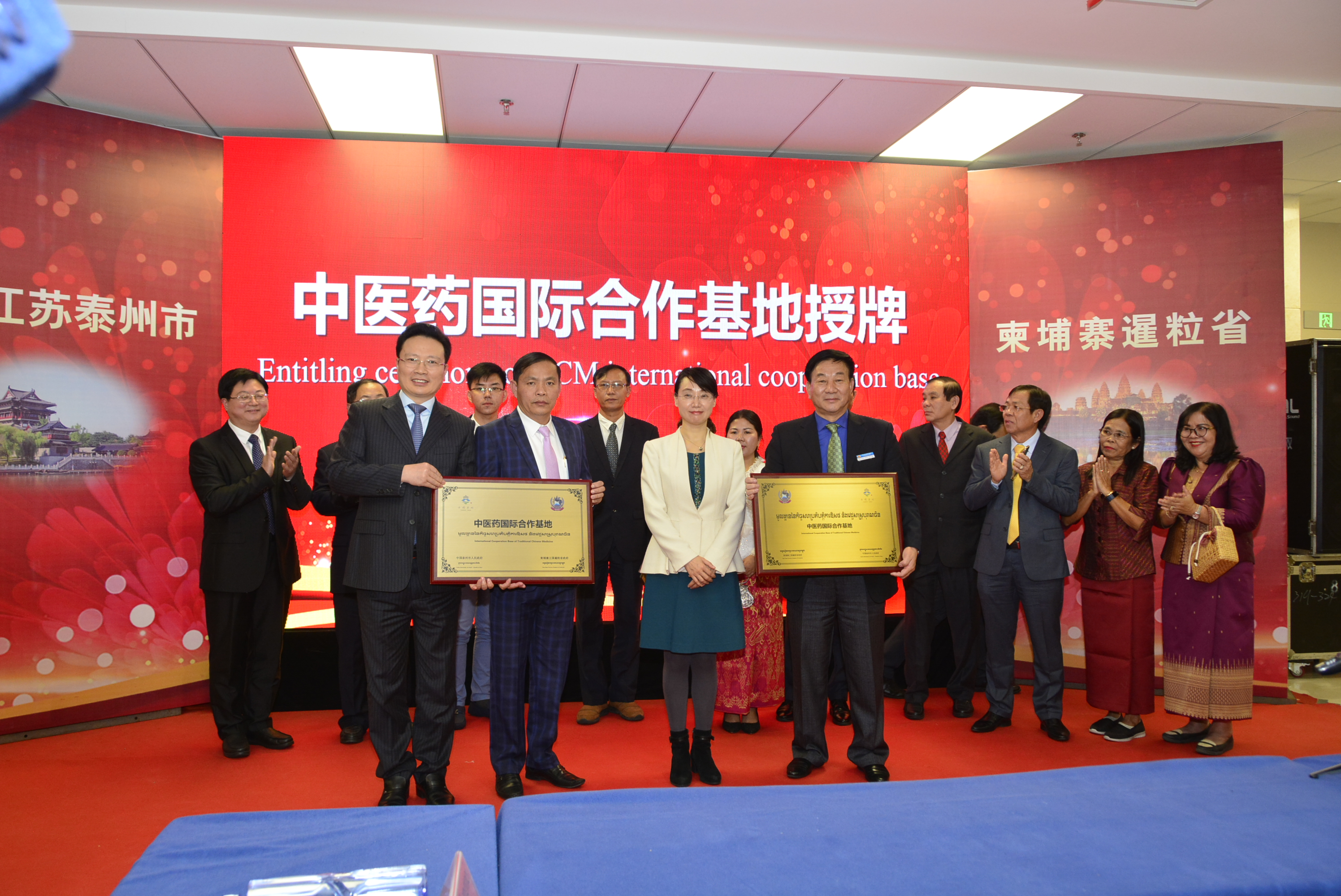 泰州市副市長(zhǎng)王學(xué)鋒和暹粒省副省長(zhǎng)本布拉格為中醫(yī)藥國(guó)際合作基地授牌