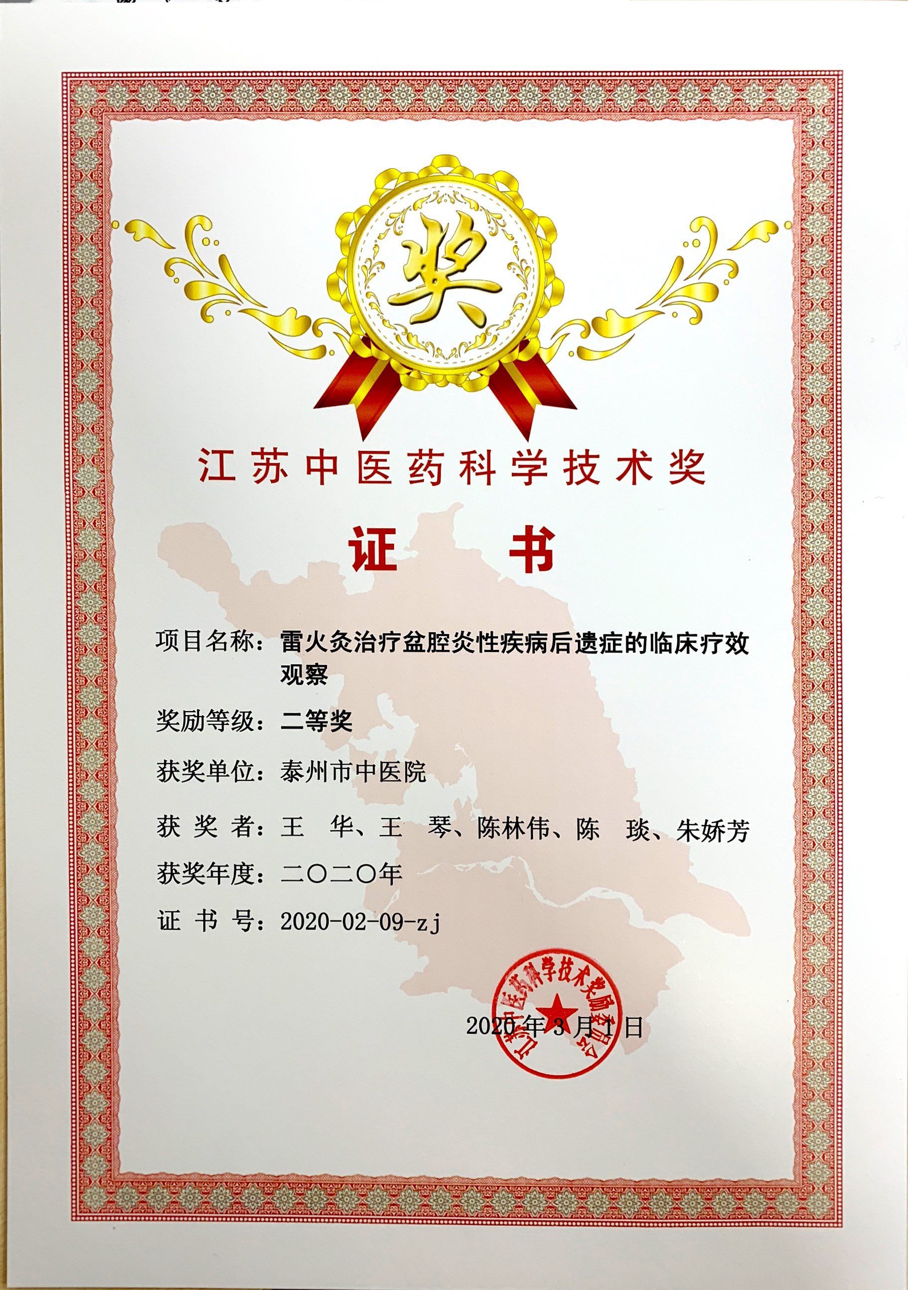近日,“2020年江蘇省中醫(yī)藥科學(xué)技術(shù)獎”評選結(jié)果揭曉,經(jīng)江蘇省各地、各相關(guān)單位遴選推薦,江蘇中醫(yī)藥科學(xué)技術(shù)獎獎勵辦公室形式審查,評審委員會按相關(guān)程序組織復(fù)評、答辯、終審,并網(wǎng)上公示,泰州市中醫(yī)院科研項目《雷火灸治療盆腔炎性疾病后遺癥的臨床療效觀察》喜獲2020年江蘇中醫(yī)藥科學(xué)技術(shù)獎二等獎。