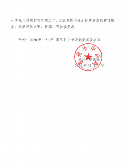 5月12日下午,泰州市中醫(yī)院“5.12”國(guó)際護(hù)士節(jié)表彰大會(huì)在會(huì)議中心舉行,院黨委書記、院長(zhǎng)王華等領(lǐng)導(dǎo)班子成員,各部門、各科室負(fù)責(zé)人及受表彰的護(hù)士代表參加了大會(huì)。
