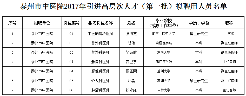 附件:泰州市中醫(yī)院2017年引進(jìn)高層次人才(第一批)擬聘用人員名單