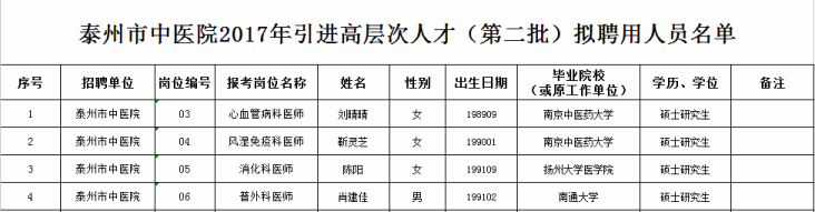 附件:泰州市中醫(yī)院2017年引進(jìn)高層次人才(第二批)擬聘用人員名單