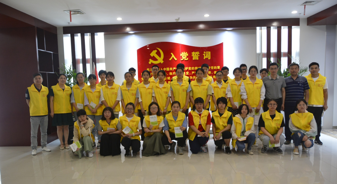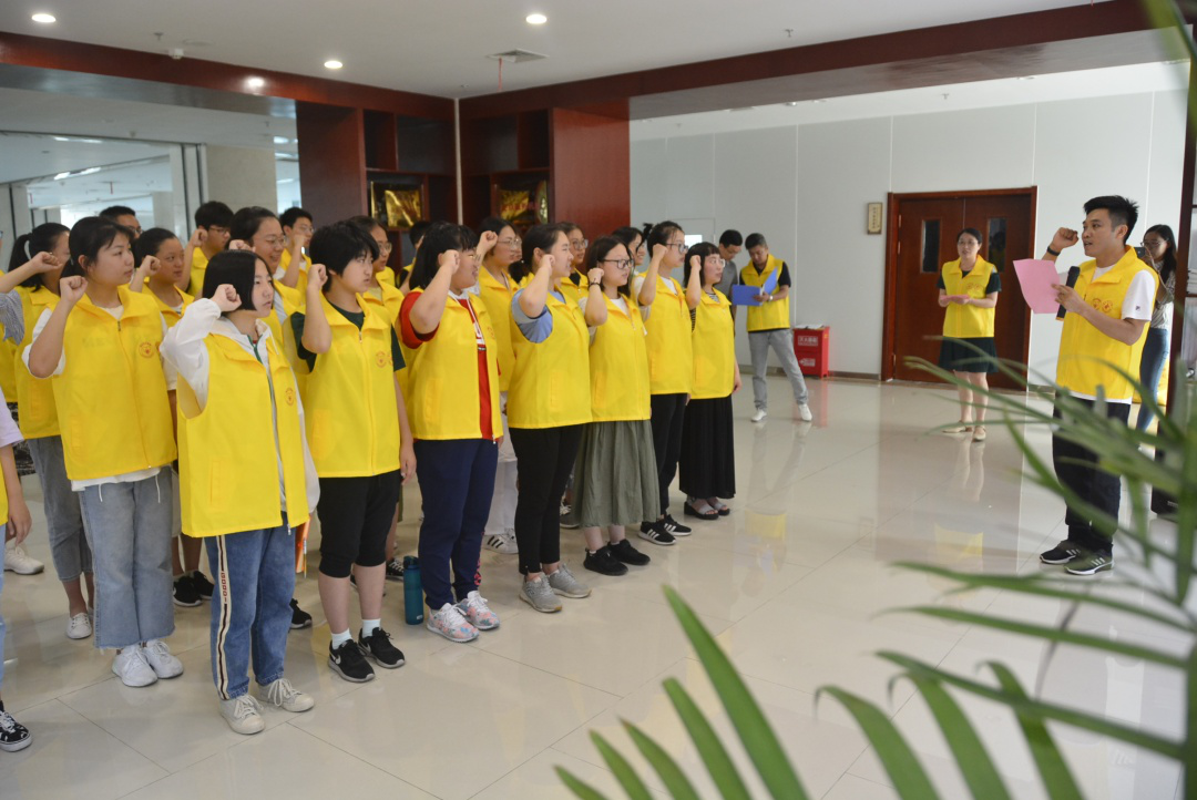 在門診大廳集合后,參加活動的青少年志愿者們穿上岐黃先鋒志愿者服務(wù)隊(duì)服裝,來到我院黨員組織生活館的宣誓大廳在團(tuán)委王威書記的帶領(lǐng)下進(jìn)行青年志愿者宣誓儀式。