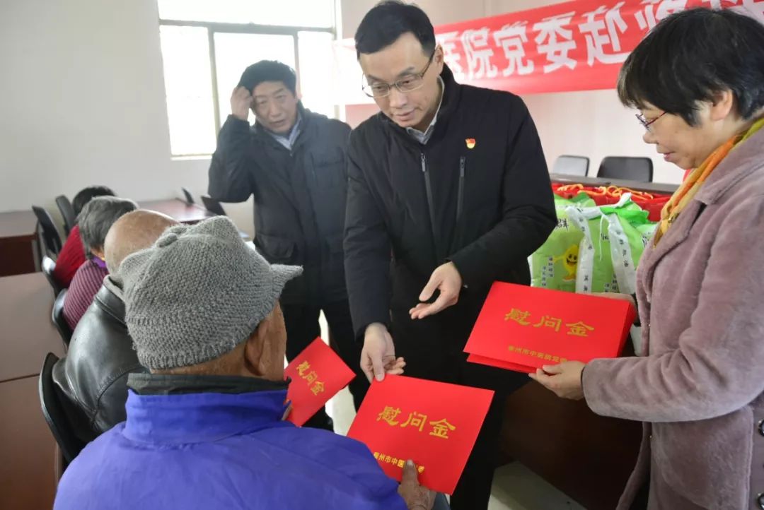 為認(rèn)真貫徹落實(shí)黨的十九大和十九屆三中、四中全會(huì)精神,鞏固深化“不忘初心、牢記使命”主題教育成果,進(jìn)一步提升廣大黨員群眾的幸福感和獲得感,確保度過一個(gè)歡樂祥和的春節(jié)。1月20日,泰州市中醫(yī)院組織開展大走訪大落實(shí)新風(fēng)行動(dòng)“關(guān)愛服務(wù)月”活動(dòng),我院黨員干部職工在黨委書記、院長王華同志的帶領(lǐng)下深入基層,來到蔣垛鎮(zhèn)界河村、雙墩社區(qū)、金東社區(qū),走訪慰問了部分老黨員代表、困難群眾、殘疾人,為他們送去了黨委政府的關(guān)懷和新春的祝福。