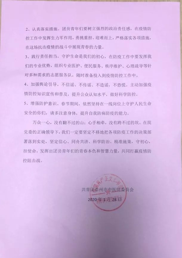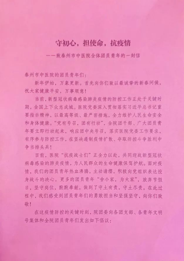 院團委書記王威宣讀《致泰州市中醫(yī)院全體團員青年的一封信》,他號召全院團干部、廣大團員青年立即行動起來,在院黨委的正確領導下,堅定不移地把各項防疫工作的決策部署落到實處,守初心,擔使命,發(fā)揮出團員青年們的青春本色和智慧力量,共同打贏疫情防控阻擊戰(zhàn)。