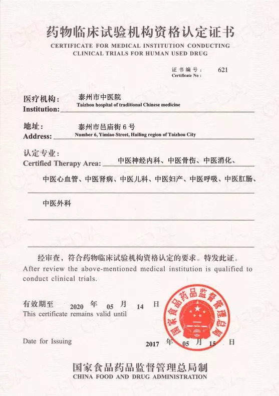 機(jī)構(gòu)于2014年01月完成國(guó)家藥物臨床試驗(yàn)機(jī)構(gòu)申報(bào),2017年03月12日~15日接受CFDA組織的現(xiàn)場(chǎng)檢查,2017年5月15日獲得國(guó)家“藥物臨床試驗(yàn)機(jī)構(gòu)資格認(rèn)定證書(shū)”。2018年10月,對(duì)14個(gè)臨床專業(yè)組(中醫(yī)神經(jīng)內(nèi)科、中醫(yī)骨傷、中醫(yī)消化、中醫(yī)心血管、中醫(yī)腎病、中醫(yī)兒科、中醫(yī)婦產(chǎn)、中醫(yī)呼吸、中醫(yī)肛腸、中醫(yī)外科、中醫(yī)腫瘤、中醫(yī)內(nèi)分泌、中醫(yī)老年科、醫(yī)學(xué)檢驗(yàn)科)進(jìn)行器械備案。