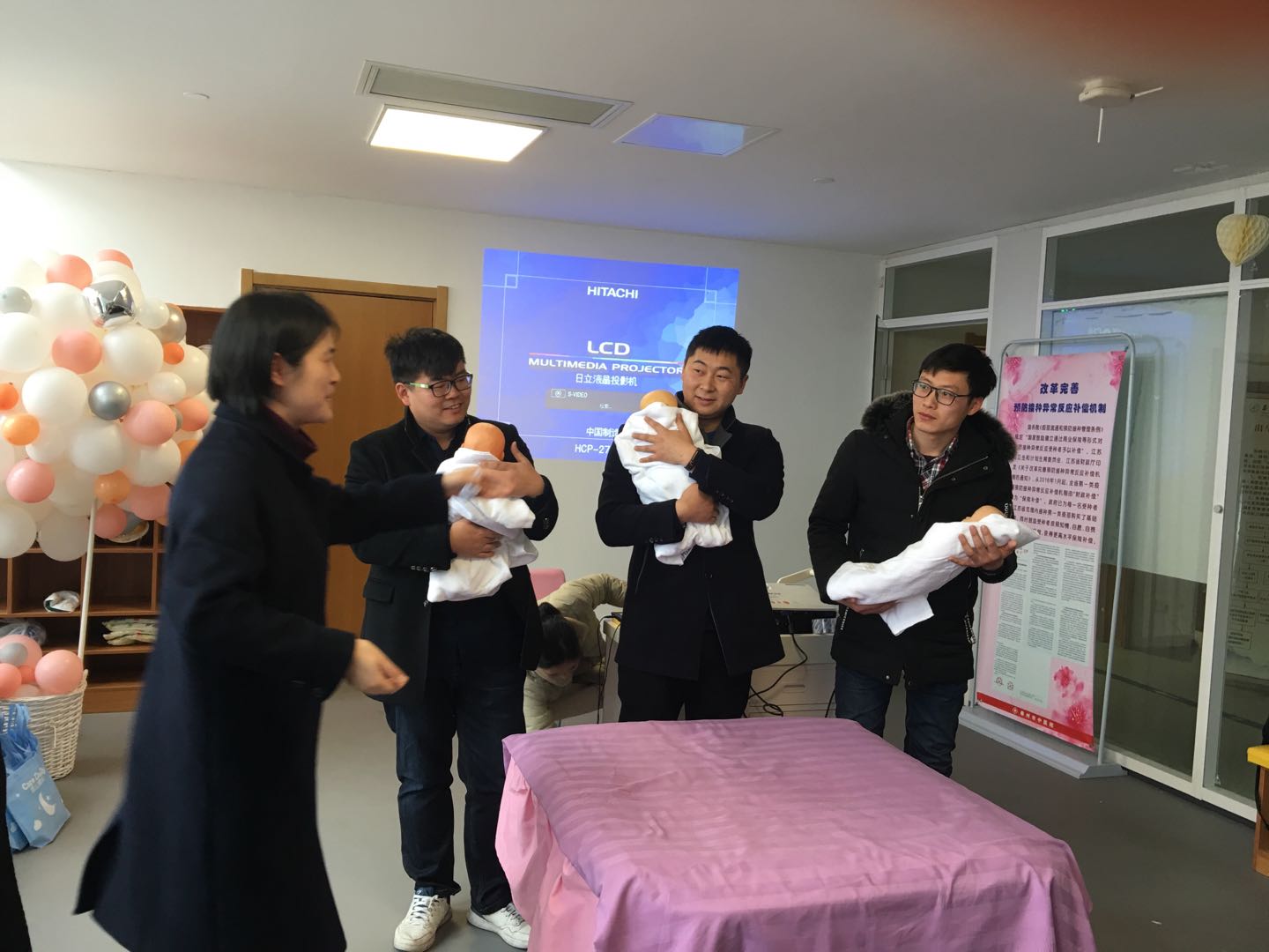 關(guān)愛婦幼,以“愛”為責,最后一個環(huán)節(jié),由產(chǎn)房吳麗萍護士長帶動大家參與沙龍活動,特別邀請在場的六位準寶爸們現(xiàn)場展示:如何環(huán)抱哭鬧的嬰兒?如何給嬰兒換尿不濕?從寶爸們笨拙的舉止和認真的態(tài)度中,大家忍俊不禁的“哄堂大笑”,這不單單激發(fā)了寶爸們的父愛,同時喚醒了男神們對我們女神寶媽們的敬畏之情,有愛有責才有家。
