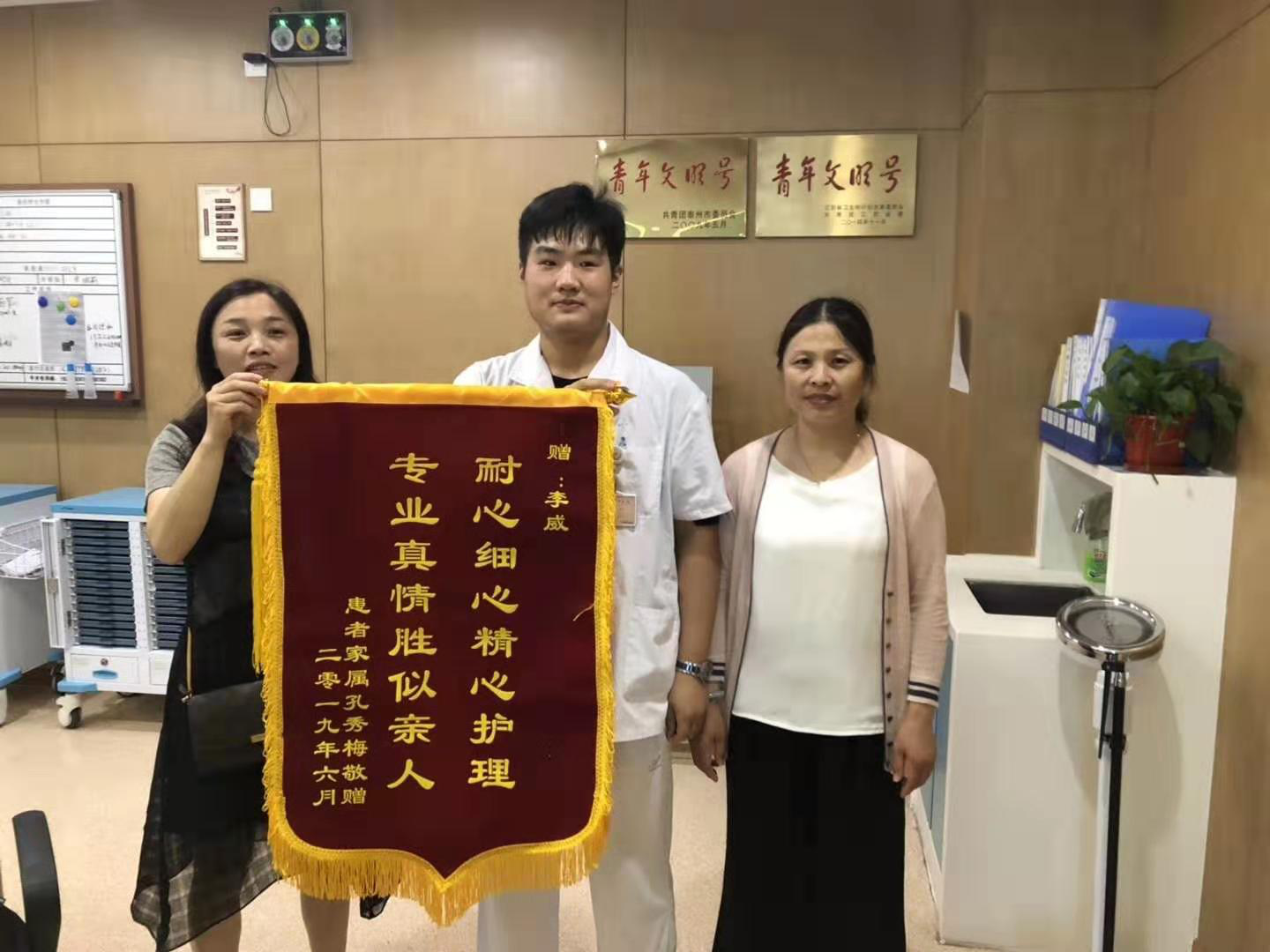 前幾日,呼吸科一位已經(jīng)離世的患者孔老爺子的女兒帶著一面錦旗,找到護士李威,感謝李威在她父親住院期間及彌留之際給予了親人般的關(guān)懷和照顧。