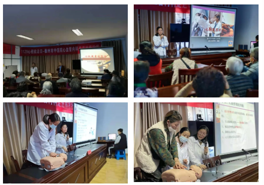 活動現(xiàn)場,心內(nèi)科曹軍主任圍繞急性心梗的癥狀及表現(xiàn)、急性心梗的治療、健康生活方式等方面向現(xiàn)場的居民介紹心肌梗死的防治知識,提高廣大群眾對急性心梗的早識別和早就診意識。急診科邱燕和心血管病科趙娟兩位護士長現(xiàn)場演繹了心肺復蘇急救正確步驟并指導群眾進行心肺復蘇操作,幫助大家了解和懂得急救技能,在醫(yī)療救護人員趕來之前,能夠首先采取正確的急救措施,有效挽救生命、降低傷害程度。