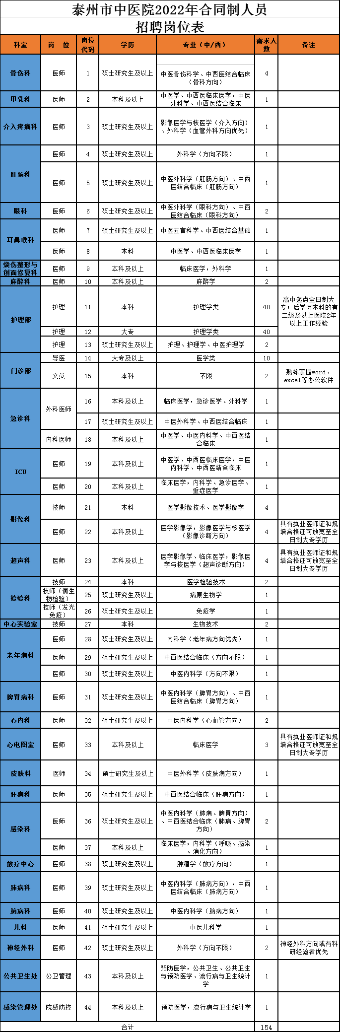 泰州市中醫(yī)院是泰州市衛(wèi)生健康委員會直屬差額撥款事業(yè)單位,2022年計劃招聘154名合同制人員,具體崗位、專業(yè)、學歷等要求詳見《泰州市中醫(yī)院2022年合同制人員招聘崗位表》(見下表)。