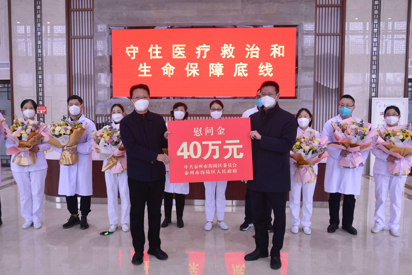 1月5日上午,海陵區(qū)委書記孫群,區(qū)委副書記、區(qū)長(zhǎng)劉劍波、區(qū)人大常委會(huì)主任丁和扣等一行來(lái)到泰州市中醫(yī)院,看望慰問(wèn)奮戰(zhàn)在一線的醫(yī)務(wù)工作者,并向醫(yī)院捐贈(zèng)了醫(yī)療物資及慰問(wèn)金,院黨委書記韓金虎、院長(zhǎng)浦政軼等參加慰問(wèn)。