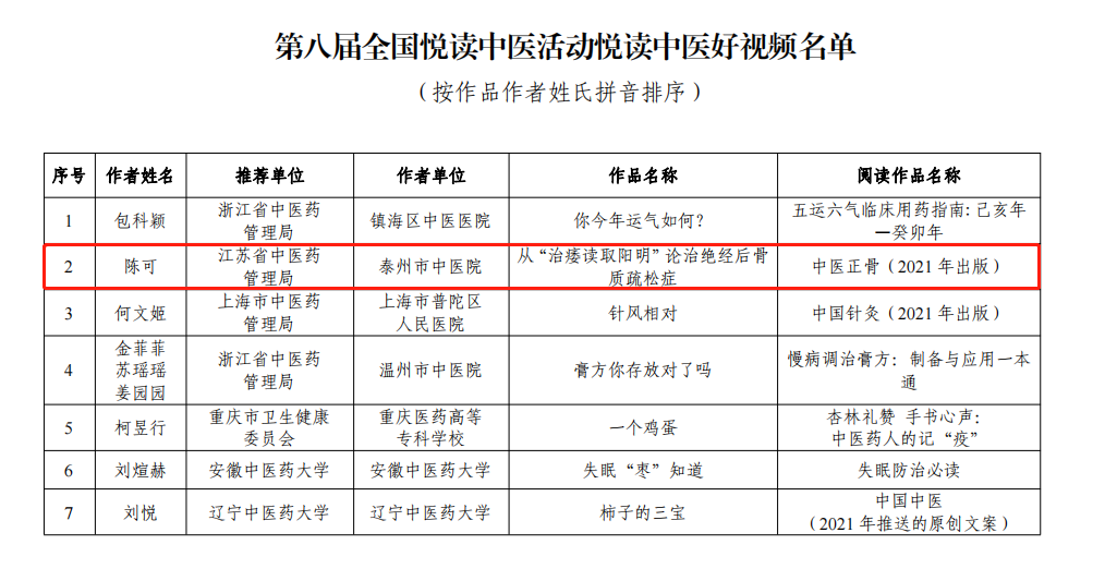 由中國中醫(yī)藥出版社、中國中醫(yī)科學院、中華中醫(yī)藥學會、《中國中醫(yī)藥報》社等單位共同主辦的第八屆全國悅讀中醫(yī)活動結果揭曉。我院榮獲“第八屆全國悅讀中醫(yī)活動優(yōu)秀成員單位”稱號,我院視頻作品《從“治痿讀取陽明”論治絕經后骨質疏松癥》獲“第八屆全國悅讀中醫(yī)活動悅讀中醫(yī)好視頻”。