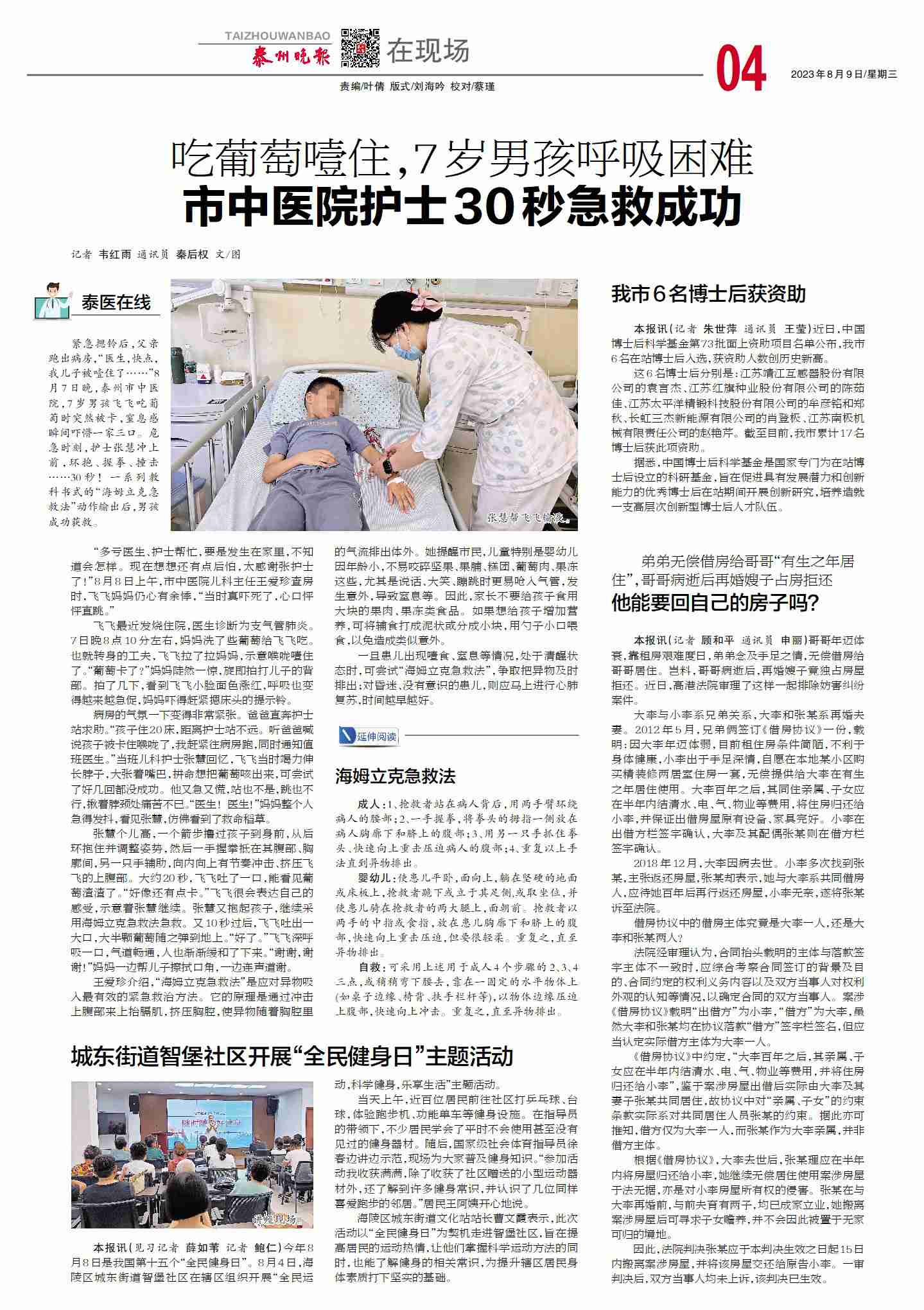 【泰州晚報8月9日】吃葡萄噎住,7歲男孩呼吸困難市中醫(yī)院護士30秒急救成功