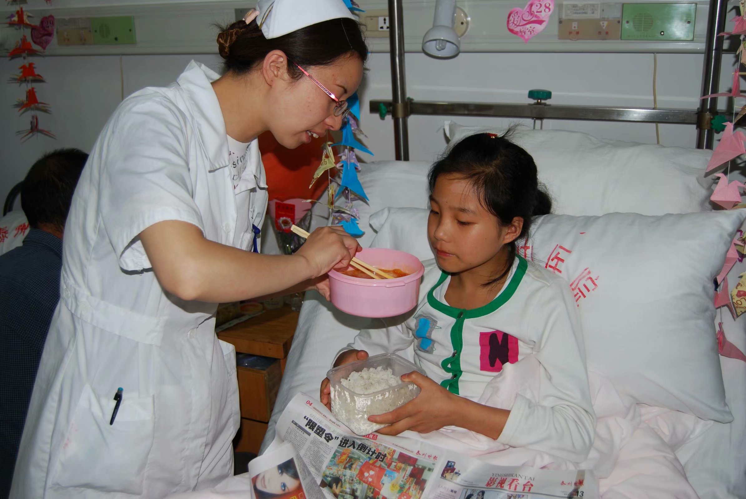 在焦急的等待中我們接到了上級任務(wù)安排,有20名四川地震災(zāi)區(qū)的傷員將被轉(zhuǎn)運到了我們泰州市中醫(yī)院繼續(xù)他們?yōu)膮^(qū)緊急處置后的進一步治療,根據(jù)領(lǐng)導(dǎo)安排,我被任命為醫(yī)院專門四川傷員而成立的“愛心病區(qū)”的護士長,負責(zé)20名地震傷員及其家屬的治療和護理工作。
