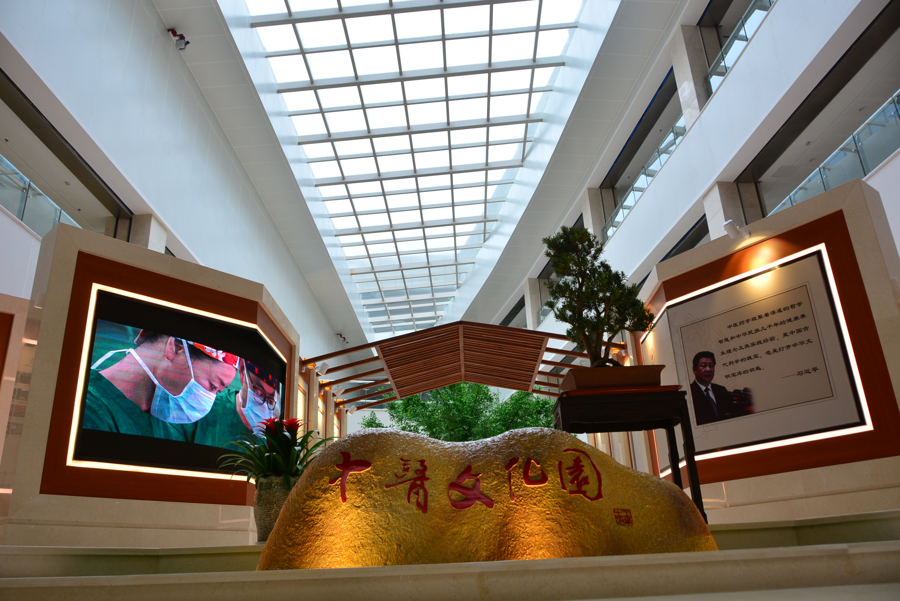 醫(yī)院文化展示區(qū)集中展示了黨建引領(lǐng)醫(yī)院文化建設(shè),包括以弘揚(yáng)新時(shí)期醫(yī)務(wù)人員職業(yè)道德為主題的本院醫(yī)務(wù)工作者本色出演的微電影微視頻展播、黨員義工服務(wù)隊(duì)、“岐黃惠民,厚植杏林”志愿服務(wù)、“大走訪,大落實(shí)”活動(dòng)、中醫(yī)特色專(學(xué))科建設(shè)、人才培養(yǎng)、名中醫(yī)工作室等。中醫(yī)藥文化園還融入了中式園林之美,小橋流水,體現(xiàn)出現(xiàn)代舒適而不失傳統(tǒng)韻味的優(yōu)美環(huán)境,與醫(yī)院各樓層不同主題中醫(yī)藥文化(七大門派典故,道地中藥材藥性、功效、主治、用法)展示相融合,一起營(yíng)造出全院濃郁的中醫(yī)藥文化氛圍。中醫(yī)藥文化園采取全天候免費(fèi)開放管理模式,年接待參觀人員5.6萬(wàn)余人次。