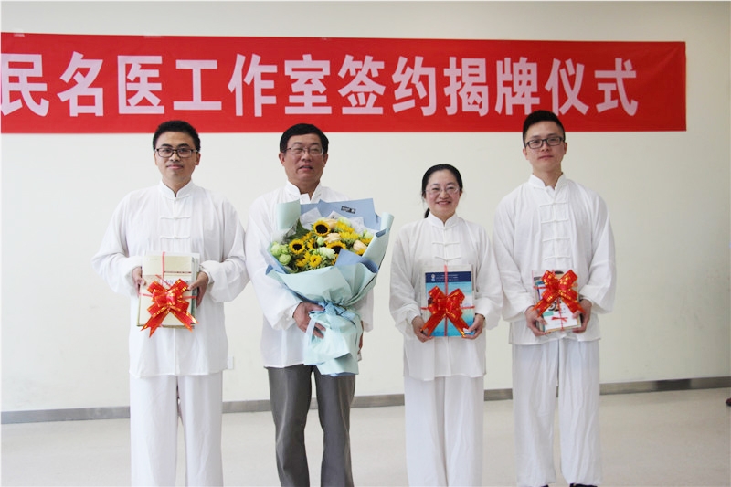 揭牌儀式現(xiàn)場還舉行了拜師收徒儀式,泰州市中醫(yī)院兒科王愛珍主任、李亞群醫(yī)師、田云龍醫(yī)師共同向韓新民教授行拜師禮(敬茶、獻花、行禮)并接受老師贈書。