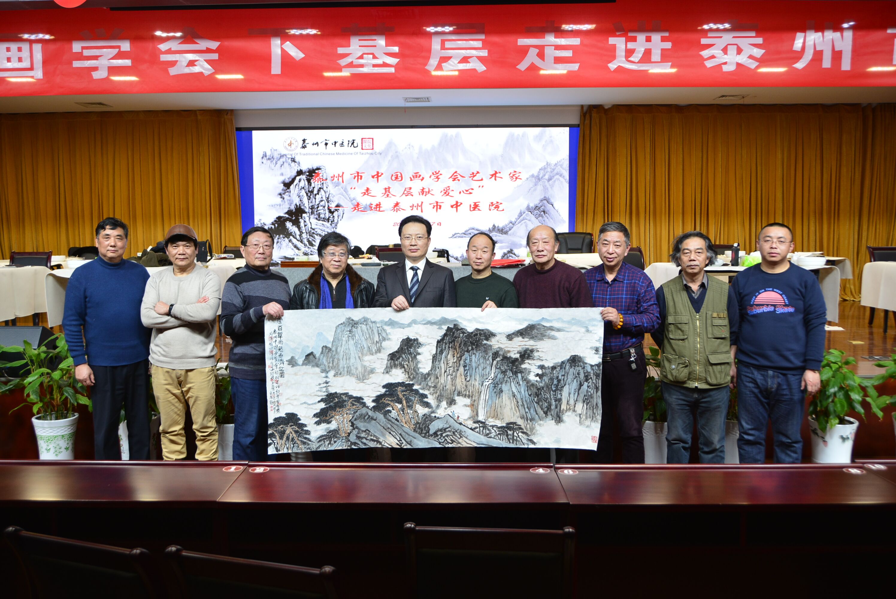 為深入學(xué)習(xí)貫徹習(xí)近平總書記在文藝工作座談會上的重要講話精神,響應(yīng)中宣部在文藝界廣泛開展“深入生活、扎根人民”主題實踐活動的號召,積極營造文藝界深入基層、扎根人民,為時代放歌、為人民創(chuàng)作、為群眾服務(wù)的環(huán)境,同時,在新春佳節(jié)來臨之際,營造一個歡樂、高雅、祥和的節(jié)日氛圍。1月17日下午,泰州市中國畫學(xué)會走基層慰問系列活動來到了泰州市中醫(yī)院,十多位藝術(shù)家用他們的方式,給工作在一線的醫(yī)護人員、醫(yī)院后勤保障人員及患者送去了美好的祝福。泰州市中醫(yī)院黨委書記、院長王華,泰州市中醫(yī)院黨委副書記孫曉軍, 泰州市中國畫學(xué)會名譽會長徐文藻、會長鄭劍君及副會長時彭年、賈廣慧、周洋、錢曉鋒,學(xué)會監(jiān)事孫廣華,副秘書長趙飛、王慶軍,學(xué)會理事陳進出席了此次活動。