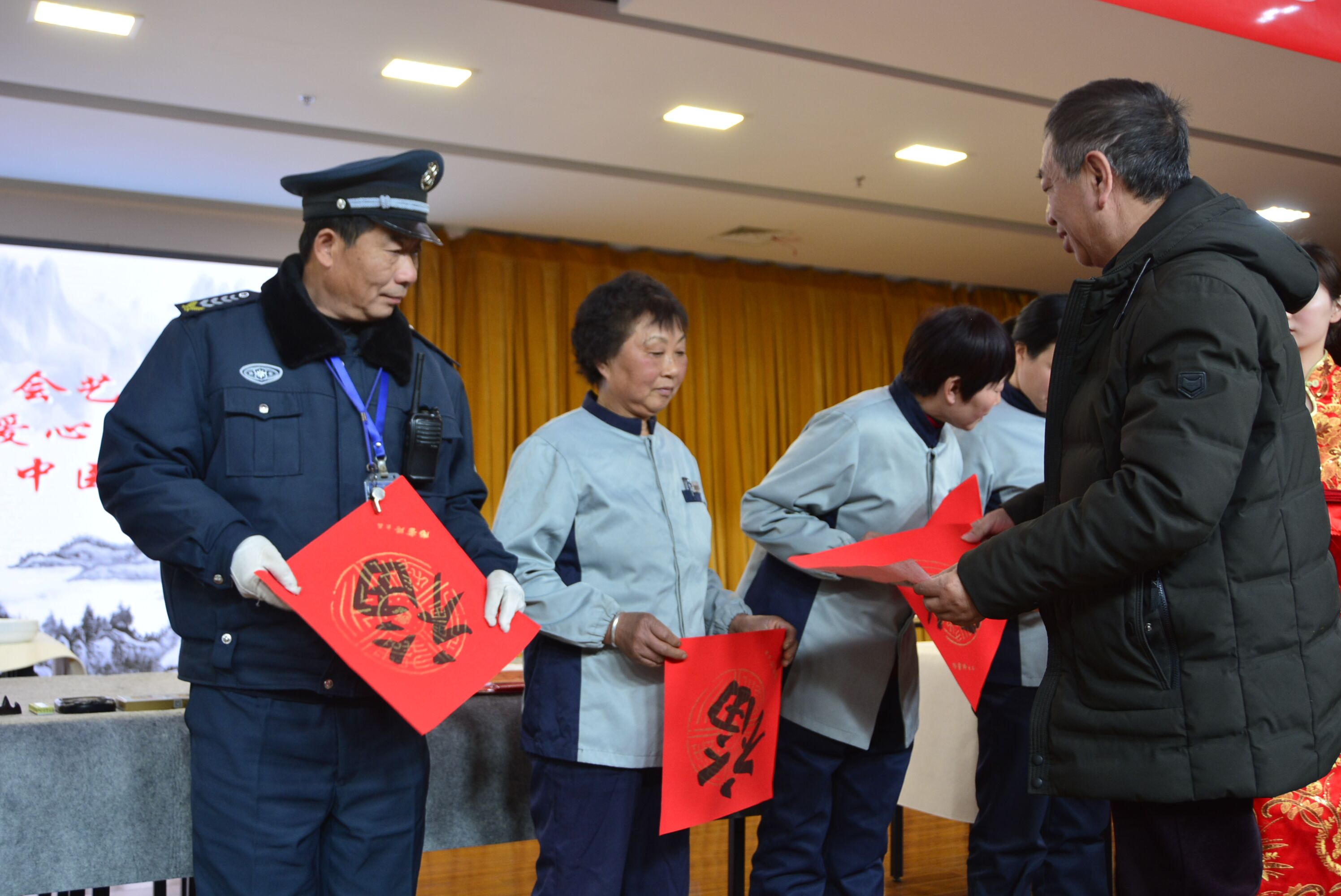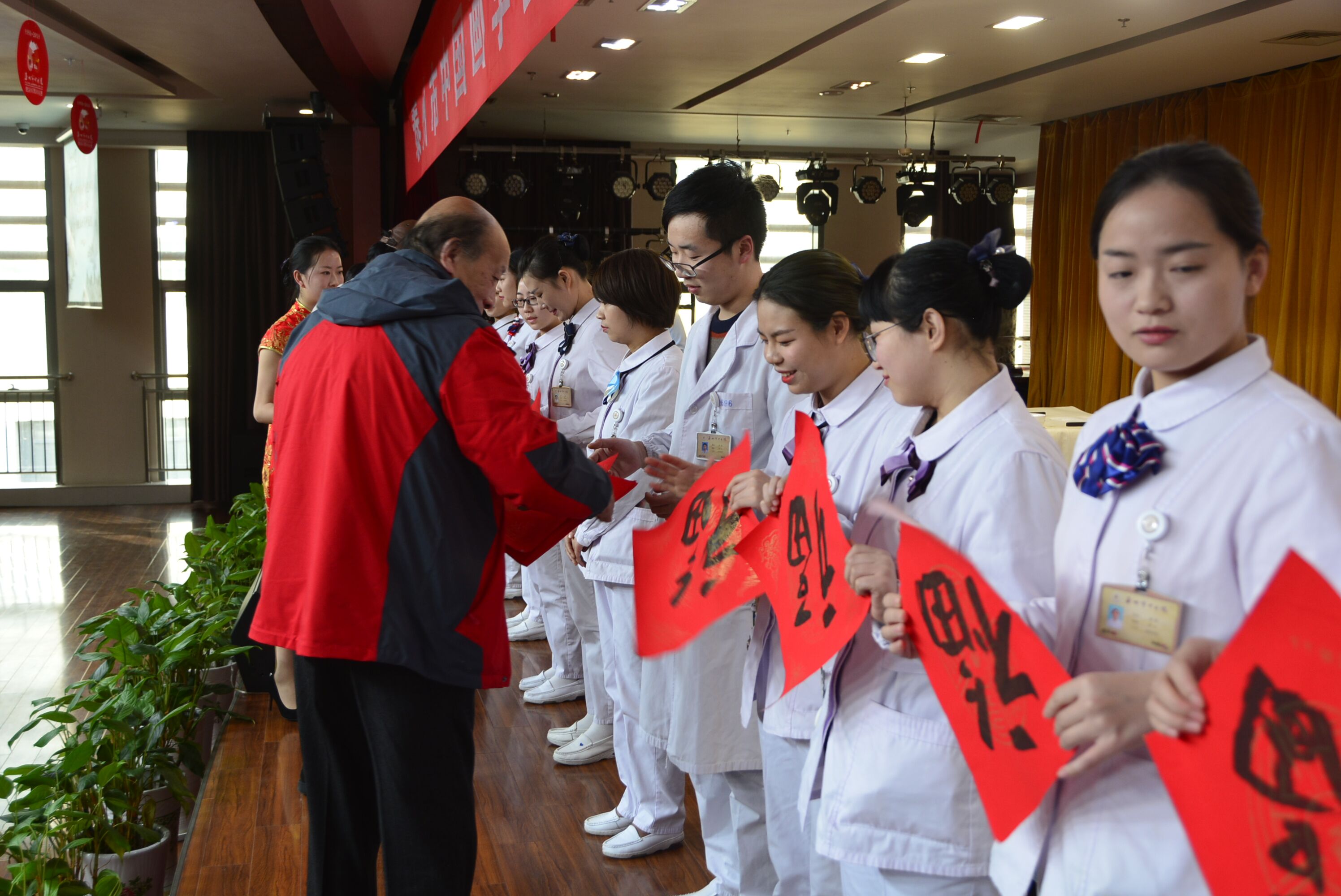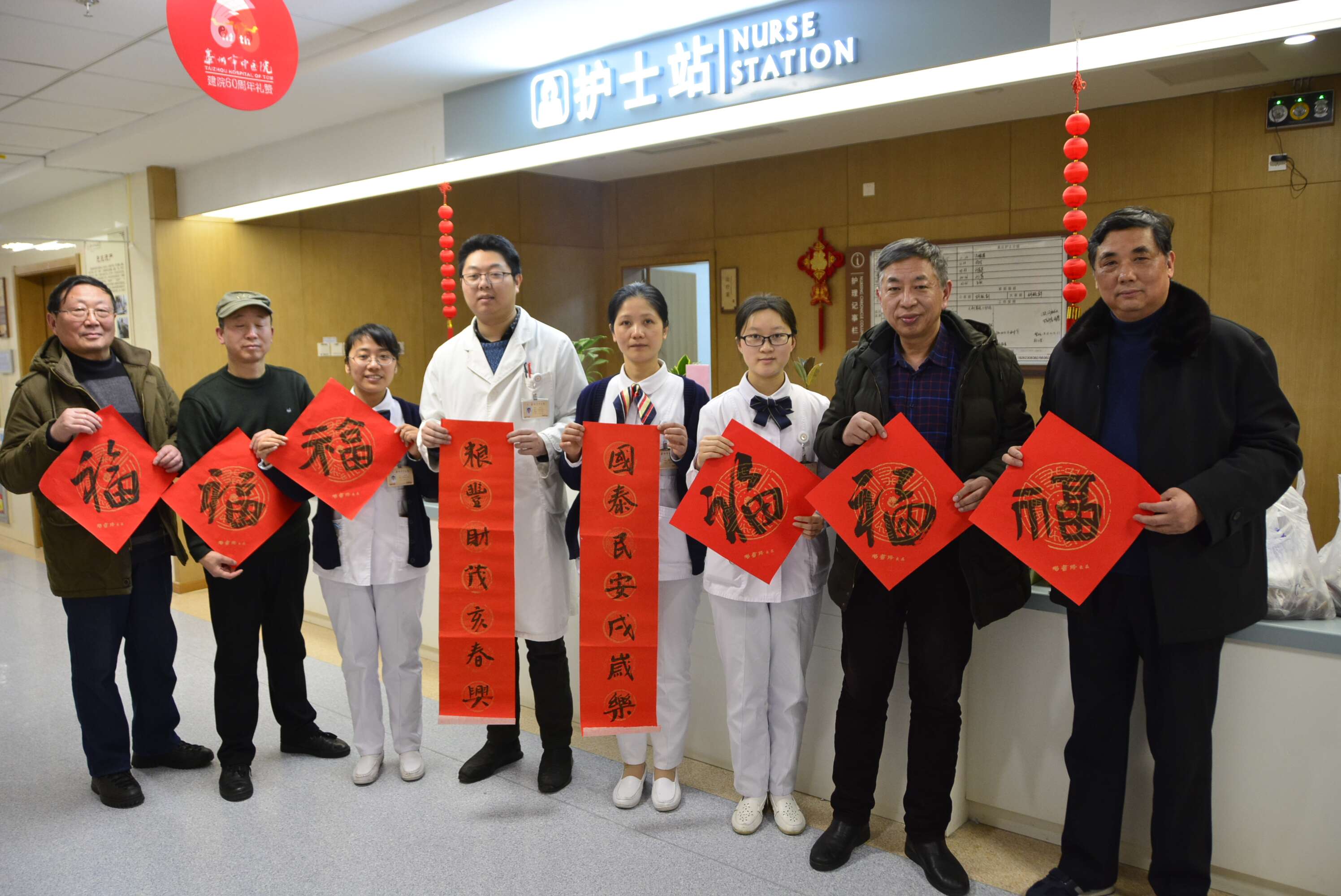 活動中,泰州市中國畫學(xué)會書畫家們把事先寫好的“?!弊趾痛郝?lián)送給醫(yī)院的醫(yī)務(wù)工作者和患者,向他們傳達(dá)新春的祝福,場面溫暖如春,歡樂祥和。